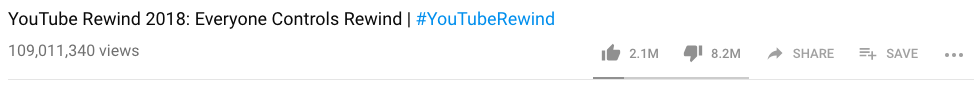 Kể từ năm 2010, đến hẹn lại lên, YouTube sẽ đăng tải một video tổng kết lại tất cả những video hay người sáng taọ nội dung được yêu thích và nổi bật nhất trong năm trên trang chia sẻ video lớn nhất hành tinh này. Năm nay cũng không phải là ngoại lệ với YouTube Rewind 2018. Thế nhưng điều đáng nói là một video thường được nhiều người yêu thích và mong chờ như YouTube Rewind năm nay lại nhận được “rổ gạch đá”. Nó nhanh chóng trở thành video có nhiều người nhấn dislike thứ hai trong lịch sử YouTube vấn 7,7 triệu dislike kể từ khi ra mắt. Chỉ kèm con số 9,7 triệu dislike của “Baby” đến từ Justin Bieber. Điều đáng nói là MV “Baby” của JB đã ra mắt từ năm 2010.