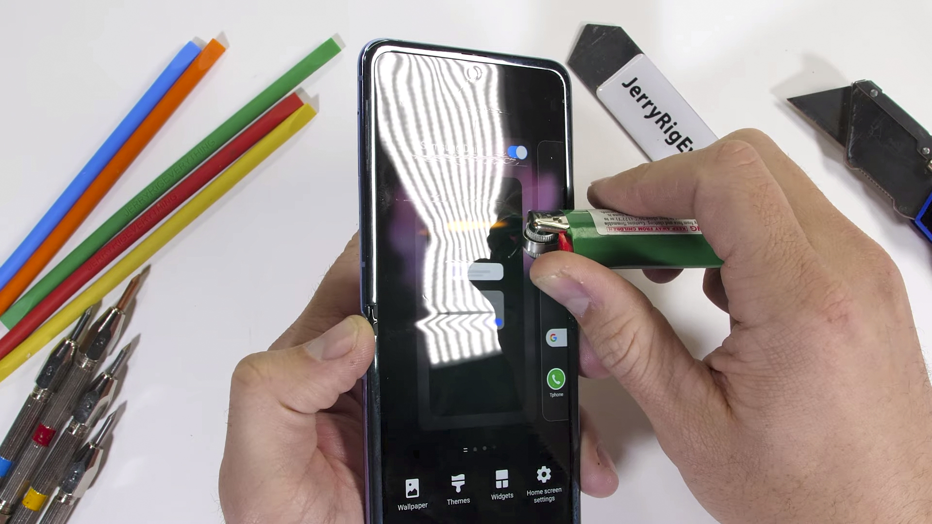 Khi thử hơ lửa, màn hình của Galaxy Z Flip đã nhanh chóng bị biến dạng gần như ngay lập tức, tương tự như các miếng nhựa khi bị đốt nóng. (Ảnh: JerryRigEverything)