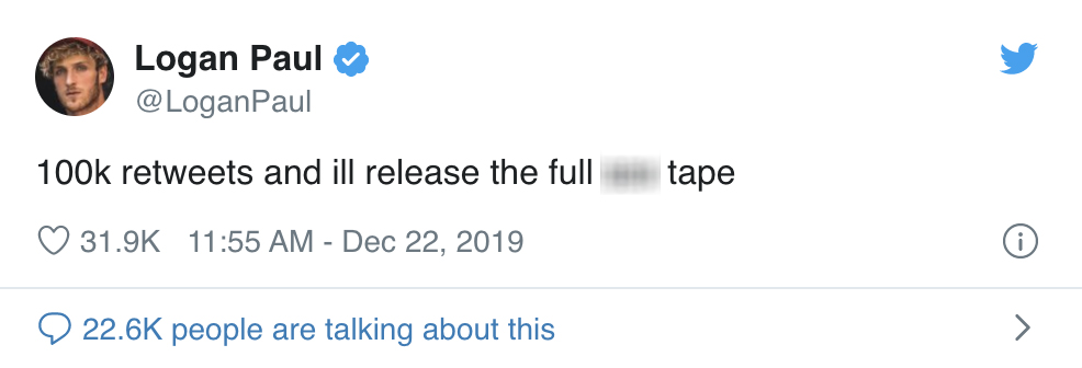 Logan Paul thách dân mạng thích bài đăng của mình. Nếu đủ 100k lượt tweet, anh chàng sẽ tự tay đăng tải đoạn video đầy đủ. (Ảnh chụp màn hình)