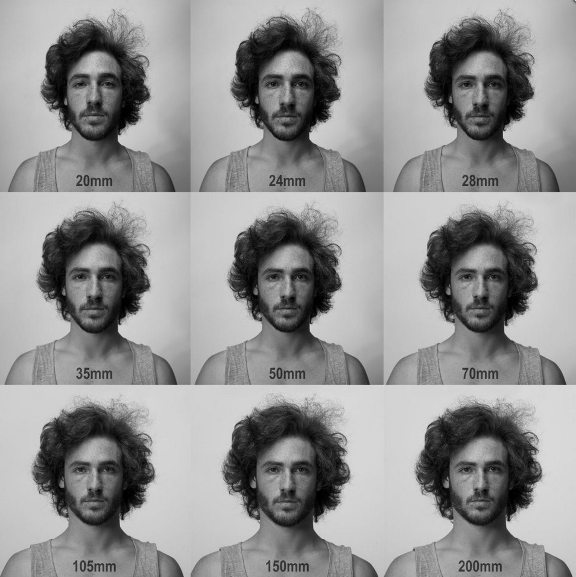 Hiệu ứng méo hình thể hiện rõ qua khác biệt trong tiêu cự: 20 - 200mm, mỗi tiêu cự cho ra kết quả khác nhau.
