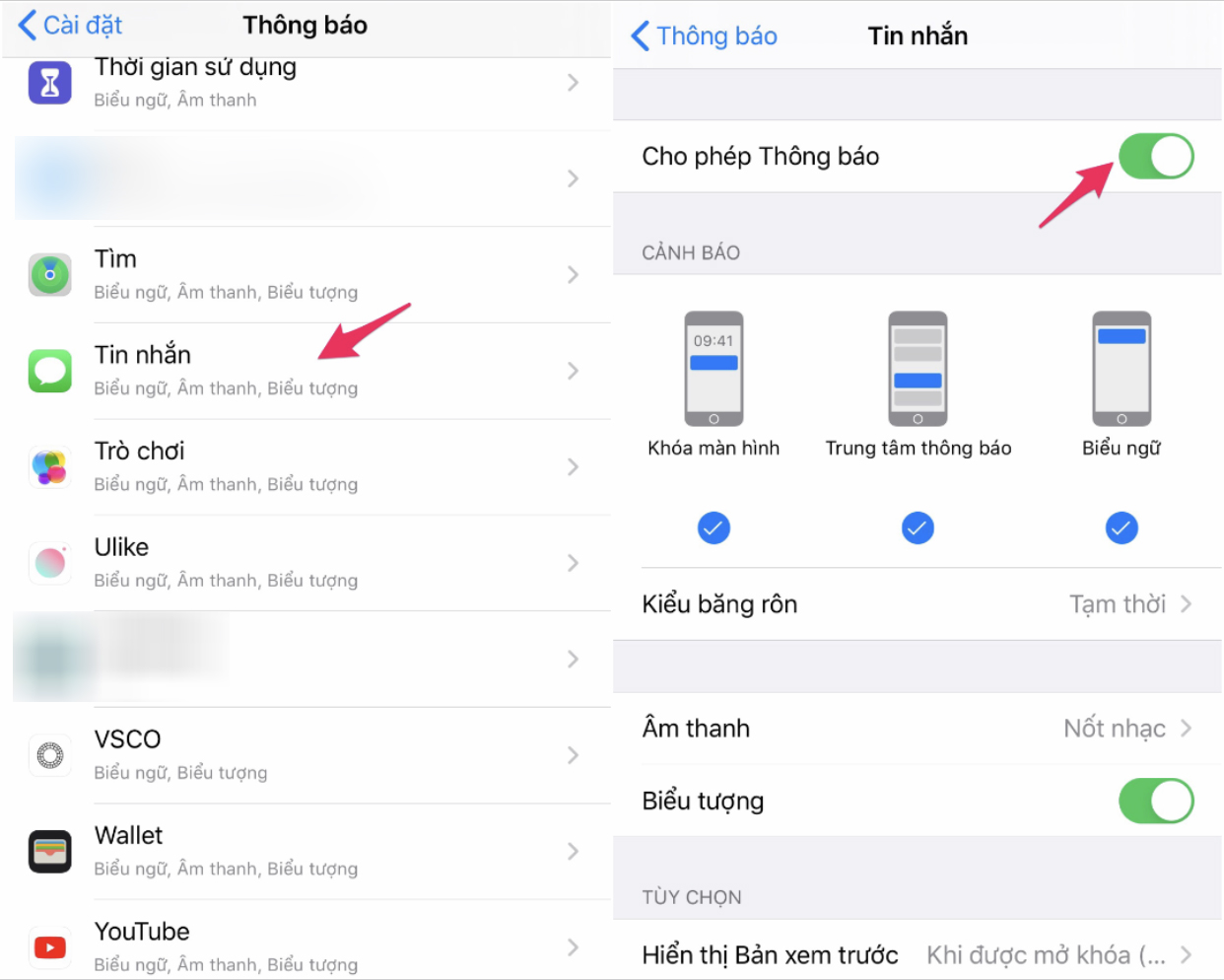 Tại đây, chọn các ứng dụng tin nhắn như iMessage, Telegram, Twitter, Messenger… và chuyển từ Allow Notifications (cho phép thông báo) sang trạng thái Off (tắt).