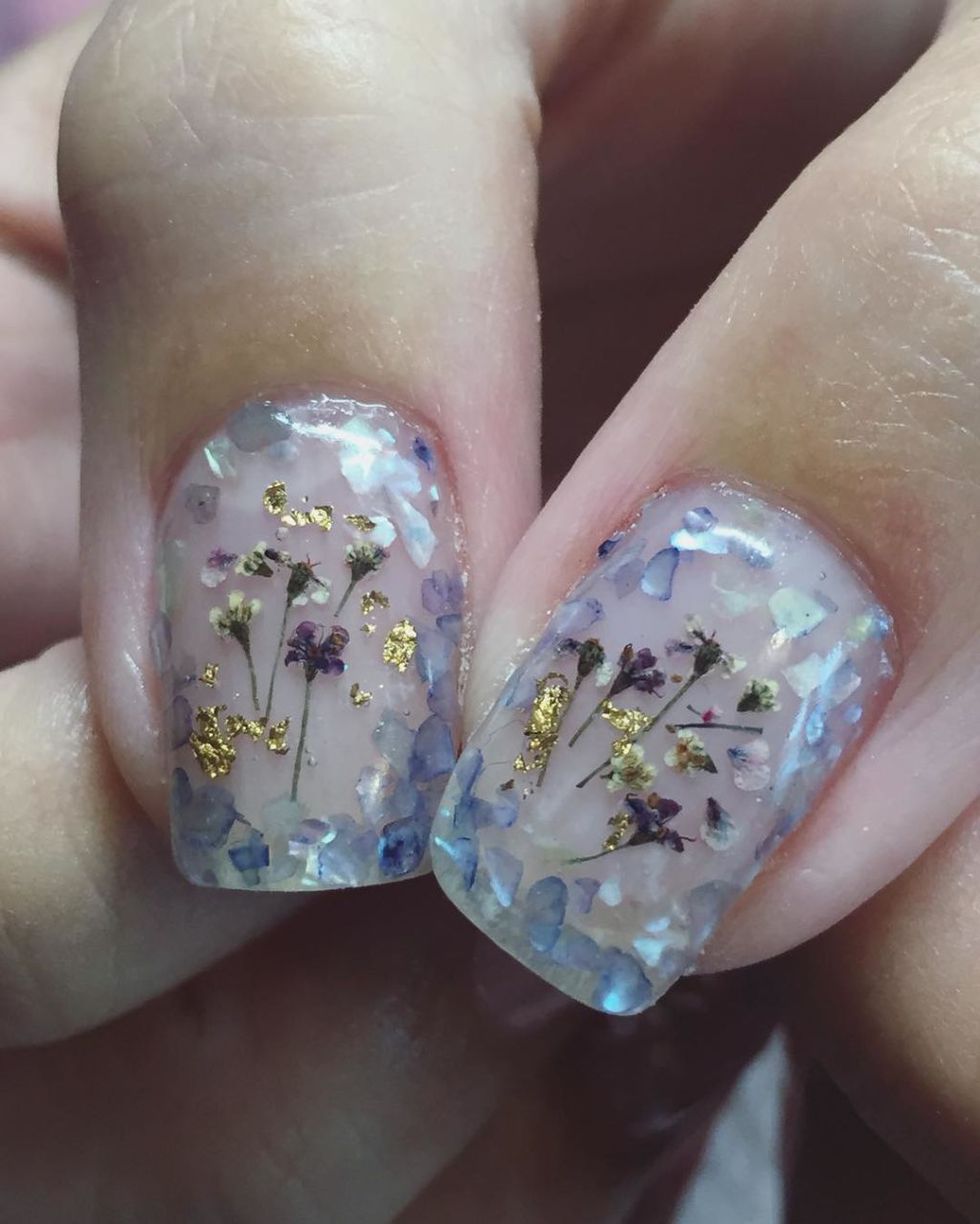 Ngoài ra, cách ép hoa khô cùng sơn bóng để trang trí móng cũng là một gợi ý hay cho các nàng khi xuống phố ngày cuối xuân.