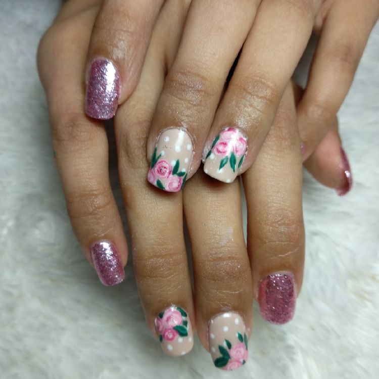 Nếu yêu thích cách làm nail này, bạn gái hãy lựa chọn các sắc màu cùng tông giữa hoa và màu móng ánh kim nhằm đem đến một tổng thể nhã nhặn, tinh tế.