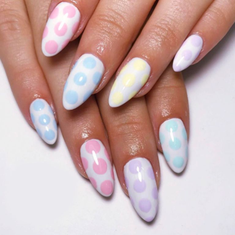 Với màu pastel, các nàng có thể thoái mái sáng tạo, phối nhiều màu trên bộ móng của mình mà không lo trở nên rối rắm. Từ loạt họa tiết chấm bi vui nhộn.