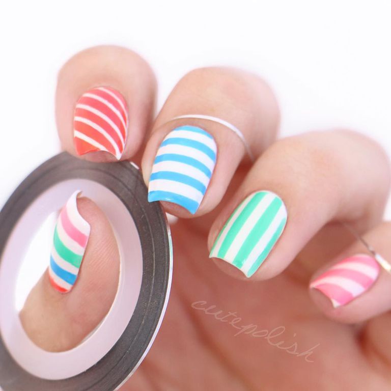 Nếu cảm thấy hoa quá yểu điệu, họa tiết hoạt hình lại trông trẻ con thì những đường kẻ sọc nhiều màu chắc chắn là một kiểu vẽ móng bạn gái không nên bỏ qua.