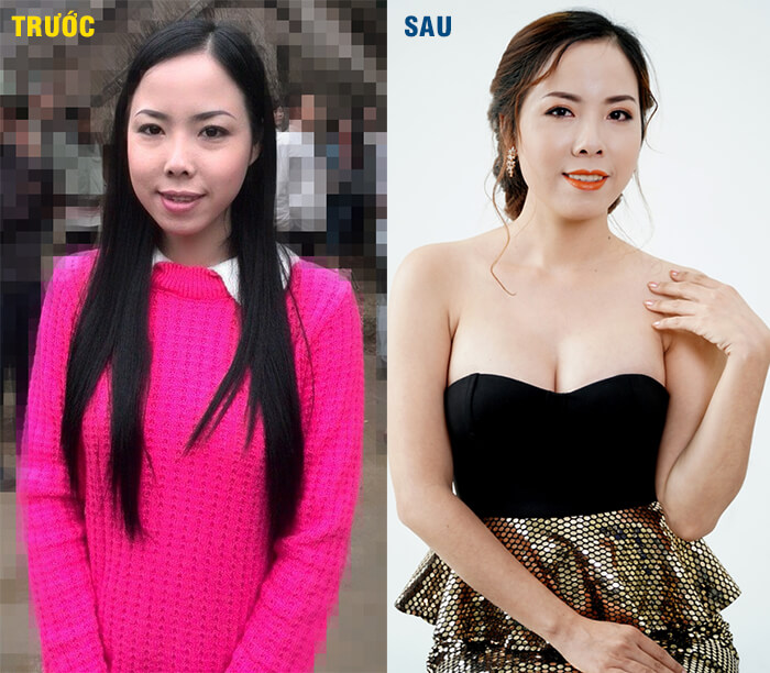 DJ Nhung Barbie - trước phẫu thuật ngực sa trễ, 2 bầu ngực cách xa nhau, lõm ngực sâu do phẫu thuật sai kĩ thuật, ngực biến dạng to nhỏ không cân xứng ( hình trái) Sau phẫu thuật ngực đầy đặn hình giọt nước, không còn lõm ngực( hình phải).
