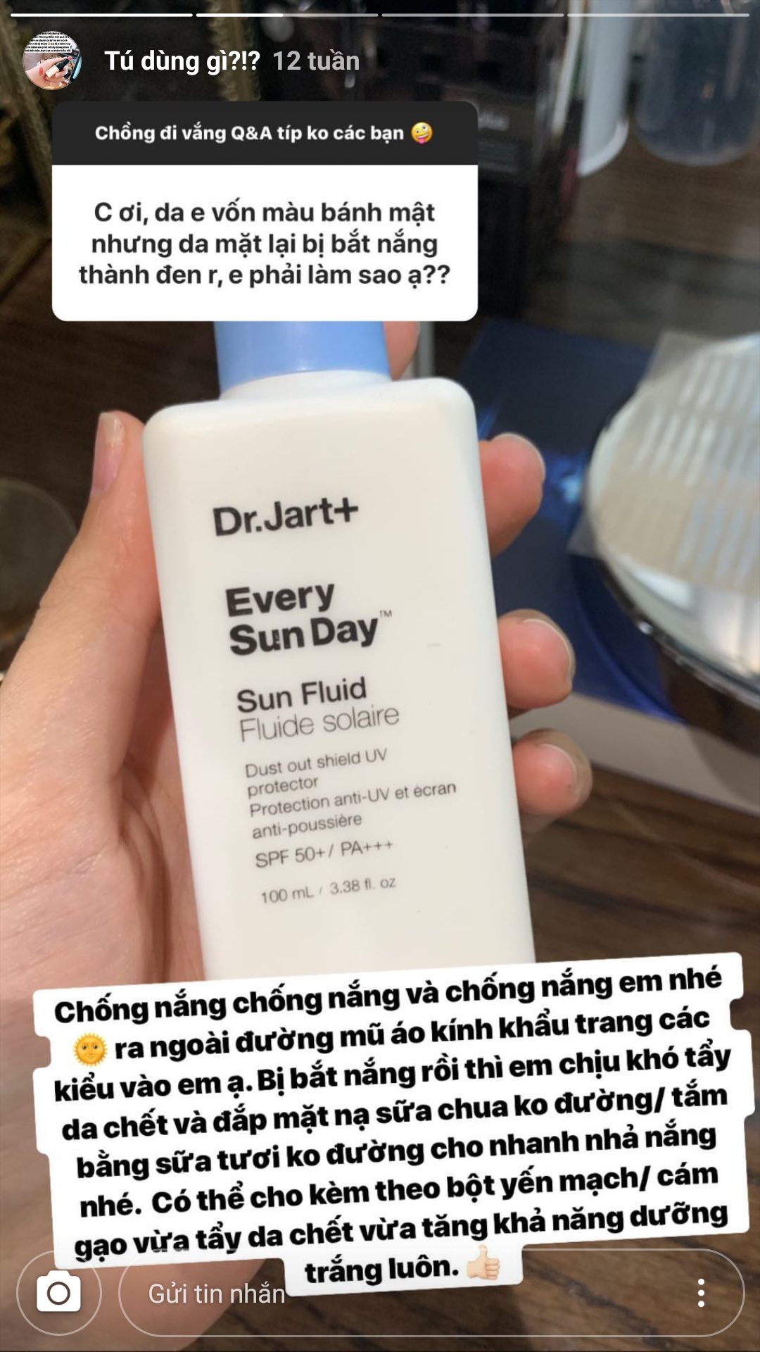 Kem chống nắng được á hậu giới thiệu có kết cấu lỏng nhẹ, tiệp vào da khá nhanh và không để lại những vệt trắng kém xinh. Một điểm cộng nữa là sản phẩm này có chứa thành phần tảo biển, có tác dụng làm dịu và dưỡng da sáng hơn.