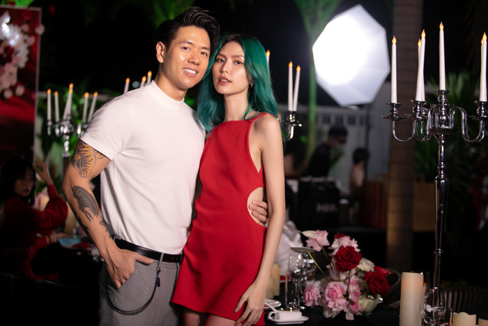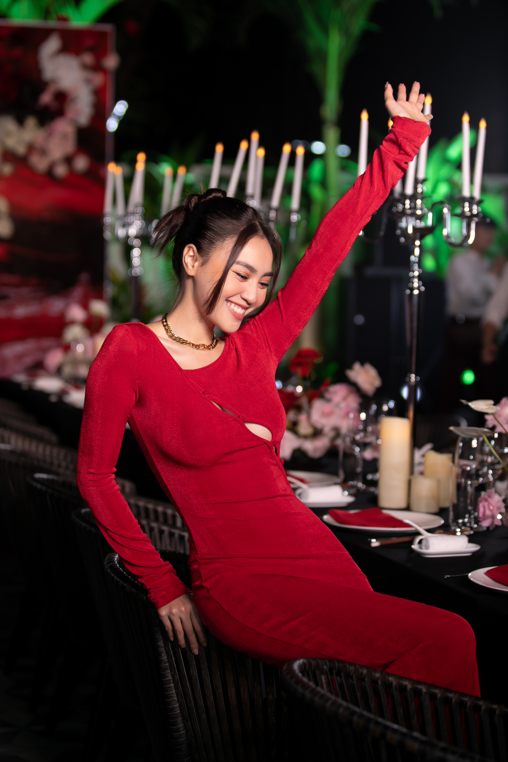 Ninh Dương Lan Ngọc khoe triệt để đường cong trong chiếc váy đỏ ôm sát, chất liệu nhung. Đường xẻ xéo được cài nút che chắn nhưng vẫn không thể giấu được vẻ quyến rũ. Tú Hảo cũng chọn cho mình chiếc váy cắt xẻ bén ngót. Người đẹp vui vẻ cùng "nam thần" Mạc Trung Kiên. Người mẫu Thùy Dương chọn cho mình chiếc váy khoét eo, phom dáng đơn giản nhẹ nhàng. Cô tham dự sự kiện với bạn trai Michael Trương.
