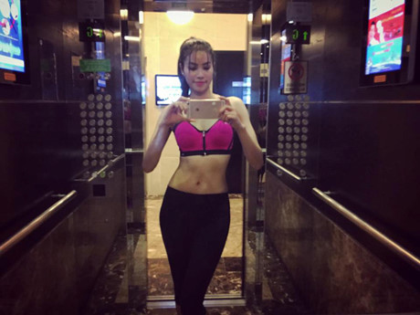 Tóc búi natra 'thời thượng' cũng được Angela Phương Trinh áp dụng trong phòng tập. Một chút son môi và má hồng giúp khuôn mặt luôn tươi tắn, hạn chế tình trạng đôi môi nhạt nhòa như 'xác chết trôi'. Nhưng lưu ý, không nên đánh phấn hay các loại mỹ phẩm gây bít chân lông dễ gây ra mụn.