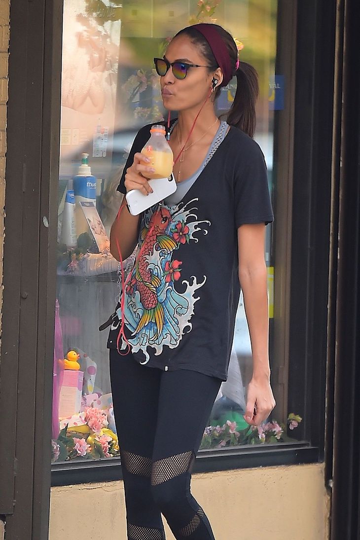 Joan Smalls kết hợp tóc đuôi ngựa với băng đô vải vừa tạo phong cách vừa có thể chặn mồ hôi chảy xuống trán.