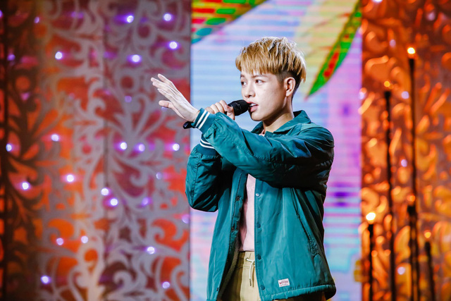 Trong một lần trình diễn ca khúc mình yêu thích, Đức Phúc chọn kiểu tóc mái dài ngang mày cùng màu nâu đất hợp tông với background sân khấu.