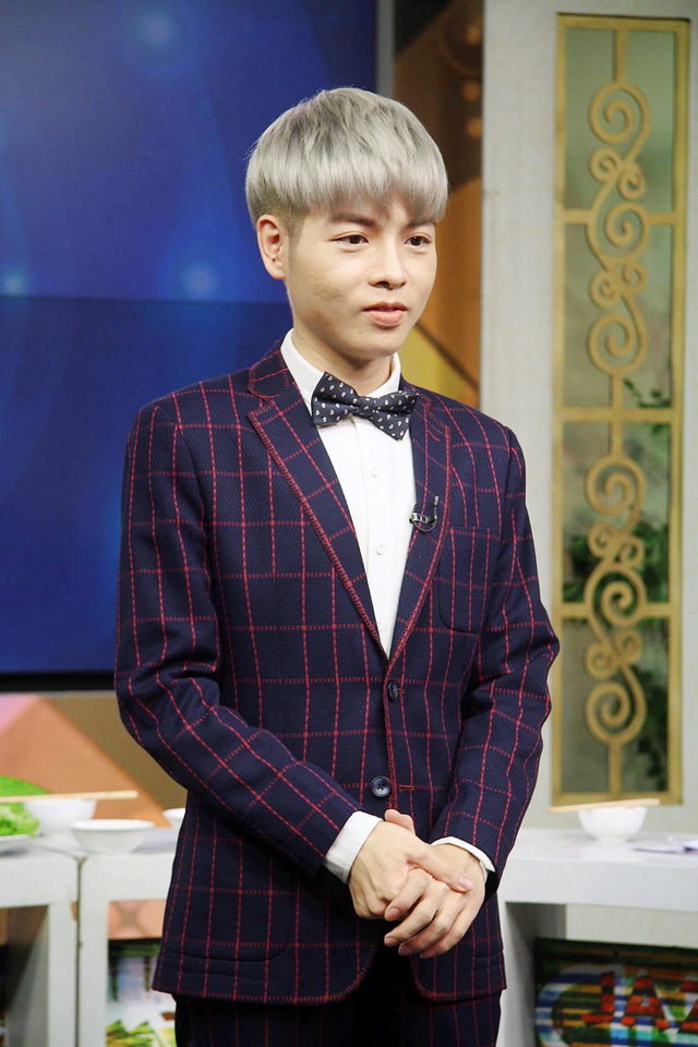 Vân là kiểu tóc mái huyền thoại ấy, Đức Phúc chọn màu tóc xam bạc pha chút nâu làm điểm nhấn trên nền trang phục vest sọc caro tối màu.