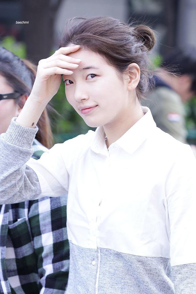 Dễ thấy Suzy không kẻ lông mày, không trang điểm mắt nhưng làn da sáng mịn đã cứu hoàn toàn nhan sắc của cô