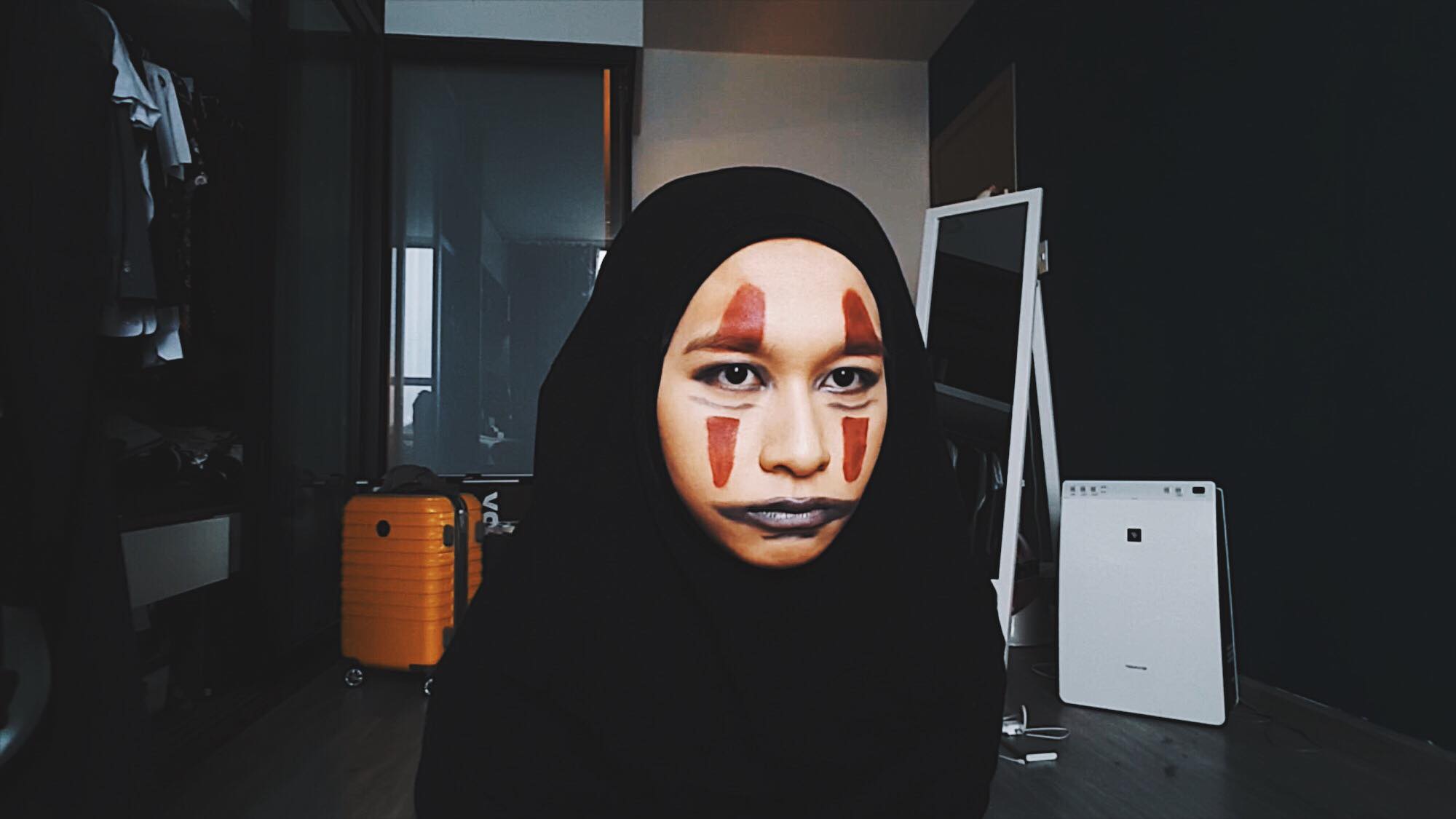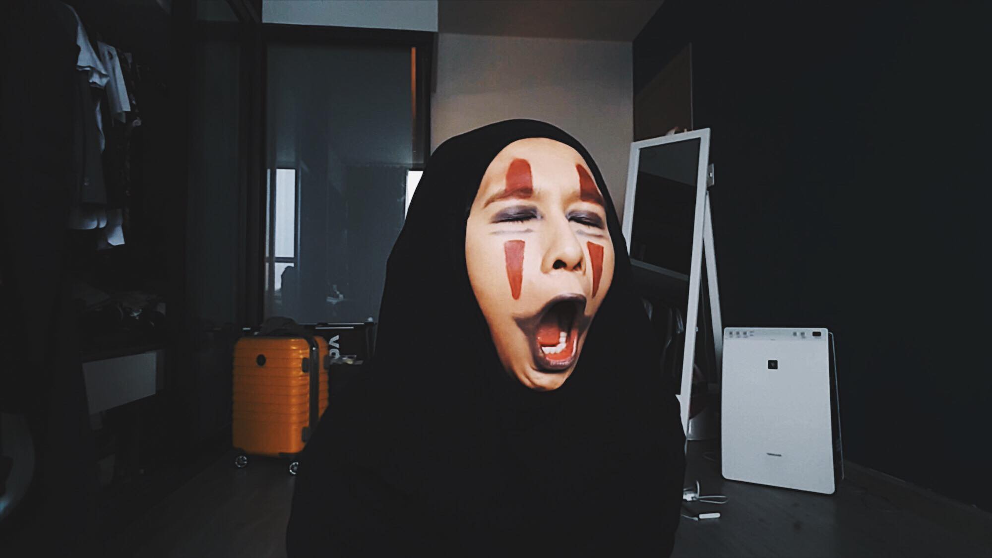 Còn về trang phục, anh chỉ dùng mỗi một chiếc áo thun màu đen trùm lên đầu mình, không thể đơn giản hơn.