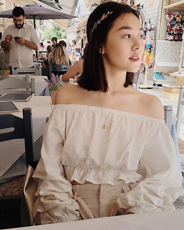 Có lúc lại hóa thành nàng thơ cùng mái tóc ngắn, vòng nguyệt quế đội đầu.