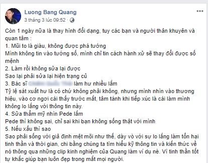 Sau khi phẫu thuật, nam ca sĩ còn chia sẻ: “Sao phải sống với giả định mệt mõi như thế, dày vò với sự lo lắng làm tổn hại tinh thần và thời gian, chi bằng chúng ta tìm hiểu kỹ thông tin và kiến thức về nó thông qua những clip kinh nghiệm của Quang làm ví dụ nè. Vì tinh thần tốt tự khắc giúp bạn luôn đẹp trong mắt mọi người.”