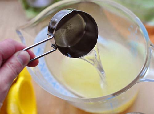 - Chanh sau khi mua về, rửa sạch bằng nước rồi vắt lấy nước cốt, lọc bỏ hạt. Sau đó trộn đều nước cốt chanh với 300ml nước lọc đến khi thu được hỗn hợp đồng nhất.