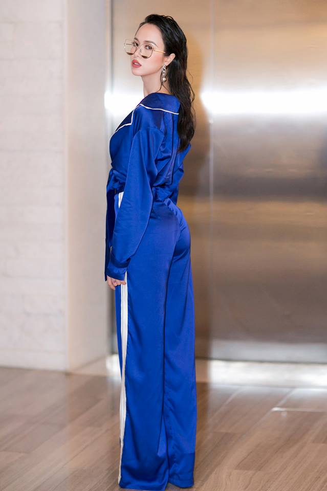 Diện bộ suit cách điệu làm bằng chất liệu lụa mềm mại, Ngọc Anh khoe khéo được vòng 3 cao, tròn của mình.