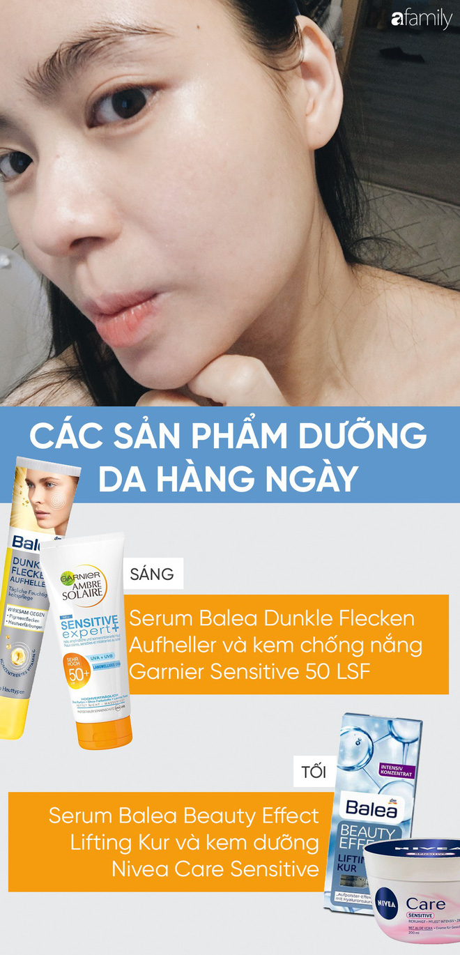 Các sản phẩm chăm sóc da của mình khá giản dị và đều là các sản phẩm được sản xuất cho tiêu dùng nội địa của Đức. Buổi sáng mình thường dùng Serum C của hãng Balea giúp da sáng khỏe và tăng năng lượng cho da cho cả một ngày dài, sau đó mình thoa kem chống nắng của Garnier dòng Sensitive 50LSF vừa đảm bảo an toàn cho da mà không gây kích ứng hay bí bết. Sau khi bôi kem chống nắng thì cho những ngày có thời gian mình sẽ thoa chút foundation và trang điểm nhẹ. Buổi tối mình sẽ dành khoảng 30 phút cho routine chăm sóc da bao gồm tẩy trang, thoa serum chứa Acid Hyaluronic của Balea và sau đó bôi kem dưỡng ẩm của Nivea dòng Care Sensitive.