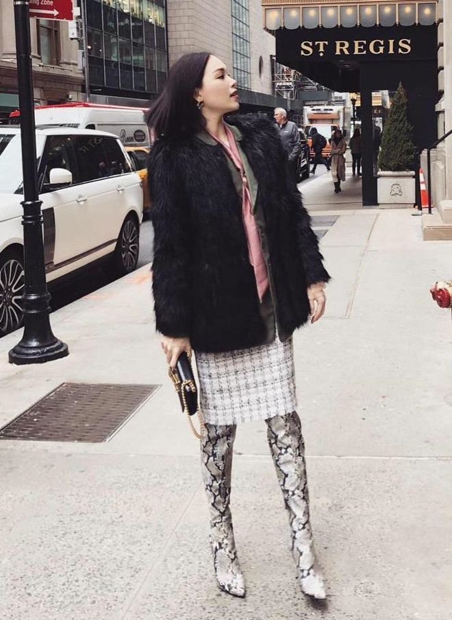 9X trông sành điệu khi phối áo khoác lông, váy chữ A kẻ cùng đôi boots họa tiết da rắn dài quá đầu gối.