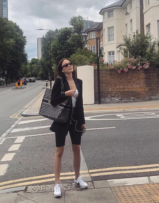 Lúc dạo phố, Linh Rin thường chọn trang phục năng động. 9X làm mới vẻ ngoài của mình bằng cách mặc áo cúp ngực bên trong và khoác vest bên ngoài. Set đồ càng trở nên cá tính hơn khi có sự xuất hiện của sneakers.