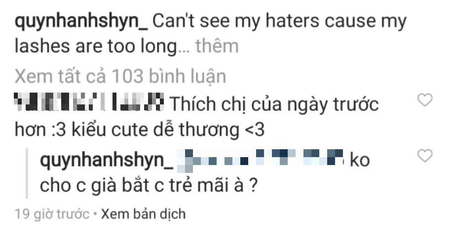 Ngay dưới phần bình luận, nhiều người hâm mộ bày tỏ sự yêu thích hình ảnh đa dạng này của Quỳnh Anh Shyn tuy nhiên vẫn còn nhiều người mong muốn nữ fashionista quay lại với hình tượng dễ thương, bánh bèo trước đây. Với cá tính của mình, cô nàng thẳng thừng đáp trả rằng: “Không cho chị già, bắt chị trẻ mãi à?”.