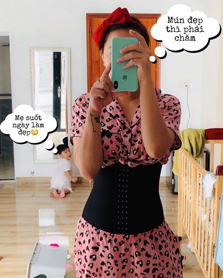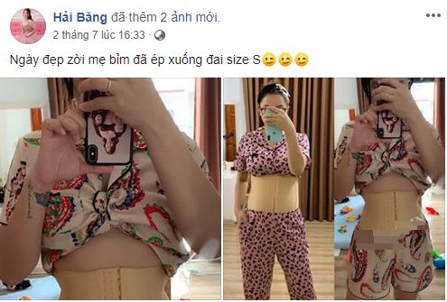 Bên cạnh đó Hải Băng cũng rất đều đặn cập nhật quá trình dùng đai nịt bụng lên mạng xã hội, cô cho biết sau sinh lần 3 này mỡ cứng hơn rất nhiều, nhưng chỉ 1 tháng sau sinh là cô đã lấy được vòng eo thon gọn, cân nặng cũng gần quay lại như thời con gái