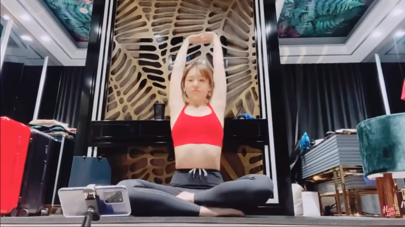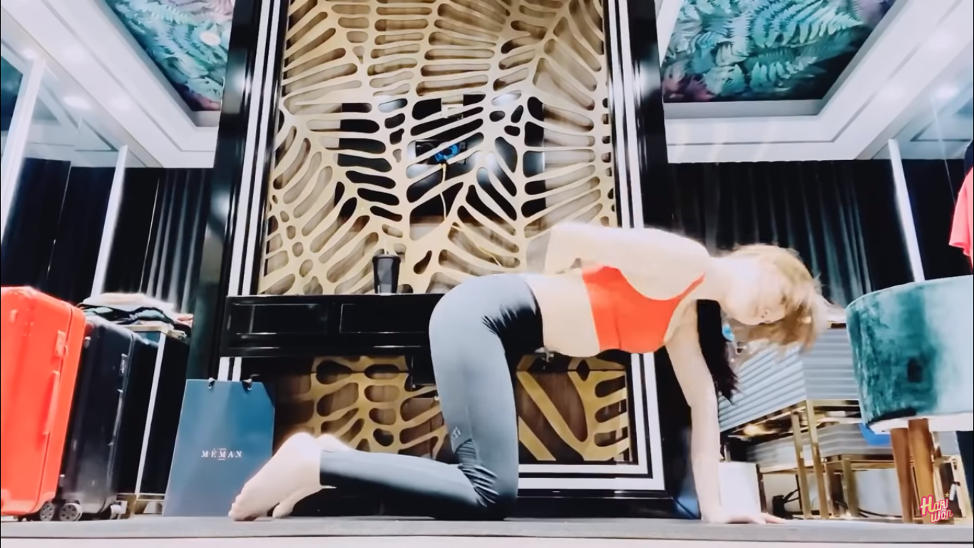Trước khi bước vào những động tác chính, Hari Won dành gần 30 phút để làm nóng cơ thể cũng như khởi động các cơ khớp