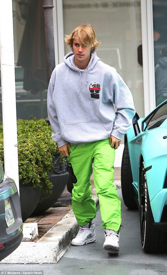 Trước đó, trong một lần hẹn hò với Selena, Justin bị bắt gặp trong bộ dạng xuề xòa, đội mũ lưỡi trai cuốn hết tóc vào trong để lộ trán mụn.