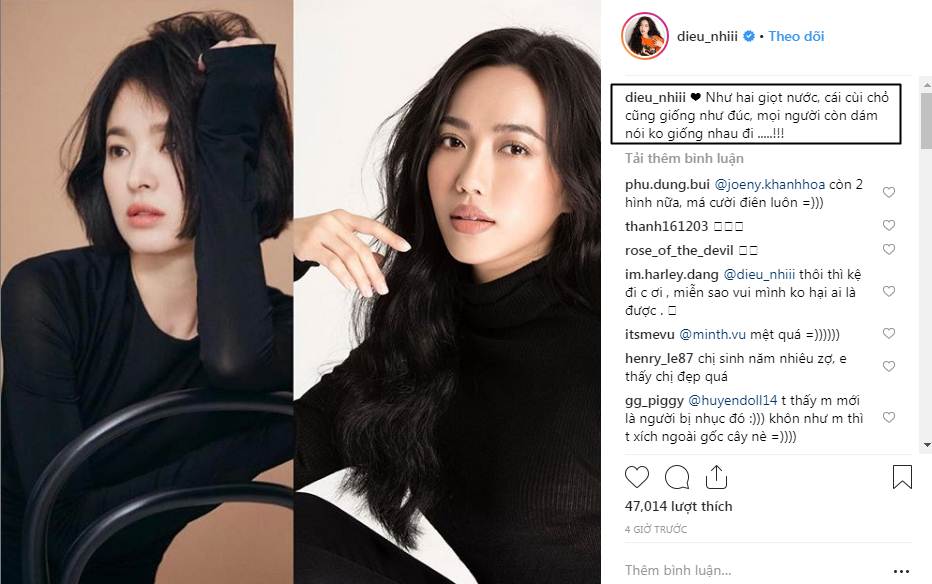 Diệu Nhi ghép ảnh so sánh bản thân với Song Hye Kyo. Cô chia sẻ” Như hai giọt nước, cái cùi chỏ cũng giống như đúc, mọi người nói không giống nhau đi”.