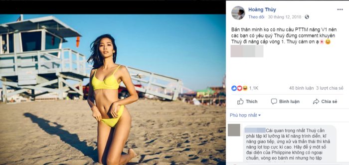 Tương tự như H'hen Niê, Á hậu Hoàng Thùy cũng sở hữu làn da nâu bóng bẩy cùng số đo ba 80 - 61- 92 . Cô từng nhận được rất nhiều lời nhận xét là cần trùng tu vòng 1, vốn là người thẳng tính, có sao nói vậy Hoàng Thùy đã đáp trả nhanh chóng trên trang cá nhân bác bỏ những định kiến cần phải can thiệp thẩm mỹ vào vòng 1.