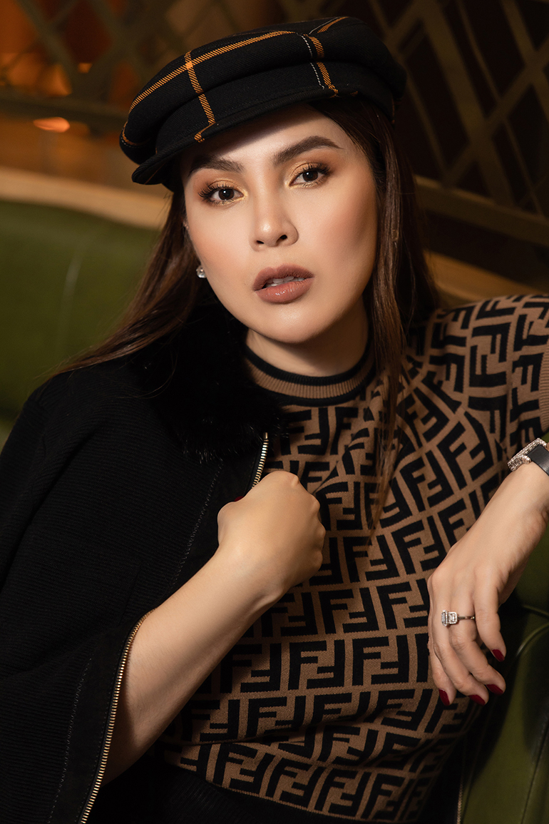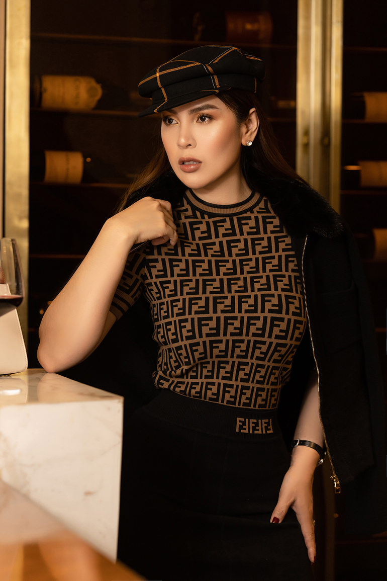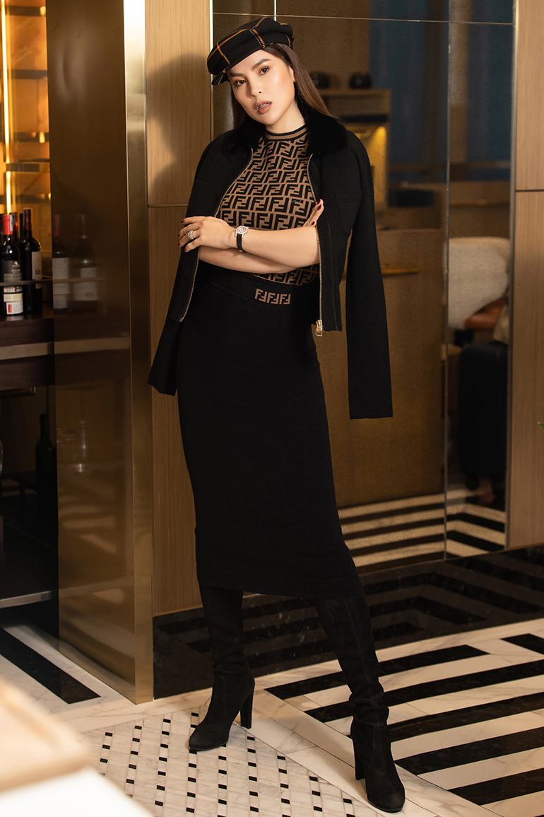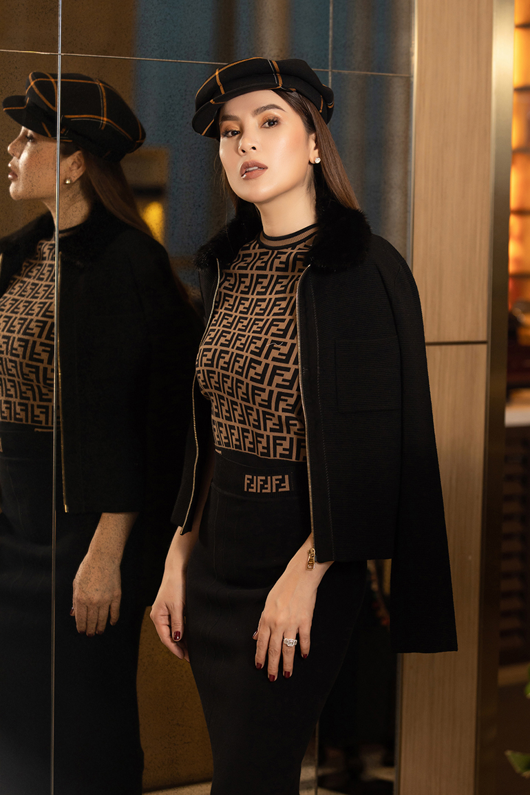 Set đồ sử dụng tông màu đặc trưng của nhà mốt Fendi gồm nâu đen tôn làn da trắng sứ của người đẹp. Phom dáng đơn giản, dễ mặc trong nhiều trường hợp khác nhau.