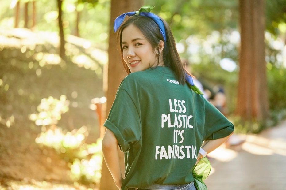 Đỗ Mỹ Linh và Phương Ly giản dị trong bộ trang phục quần jean và áo T-shirt mang thông điệp của chương trình “Less Plastic It’s Fantasic”.