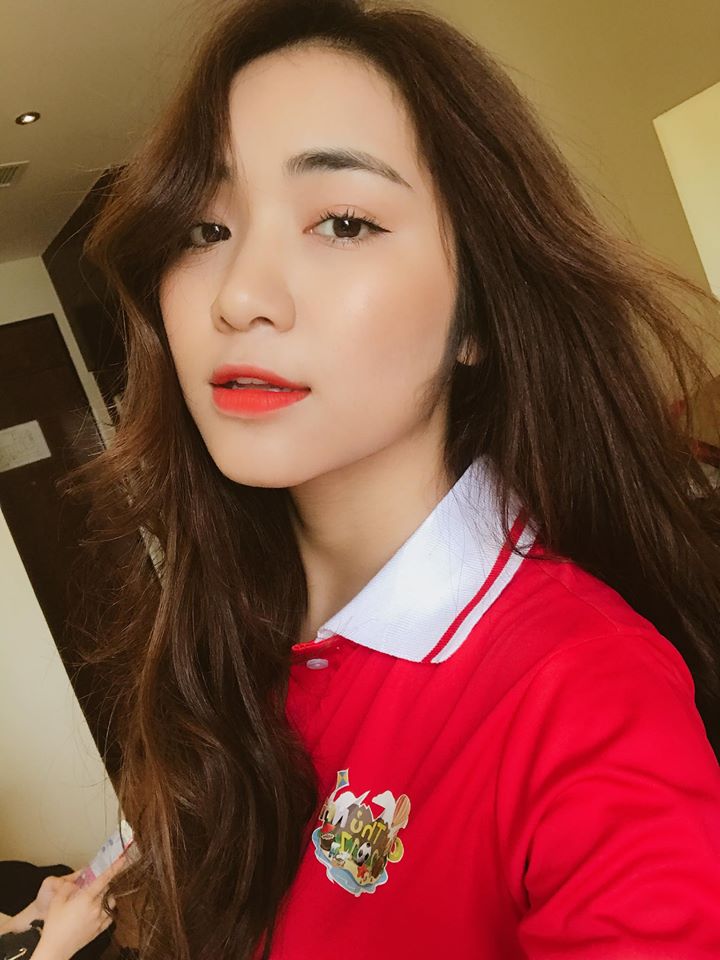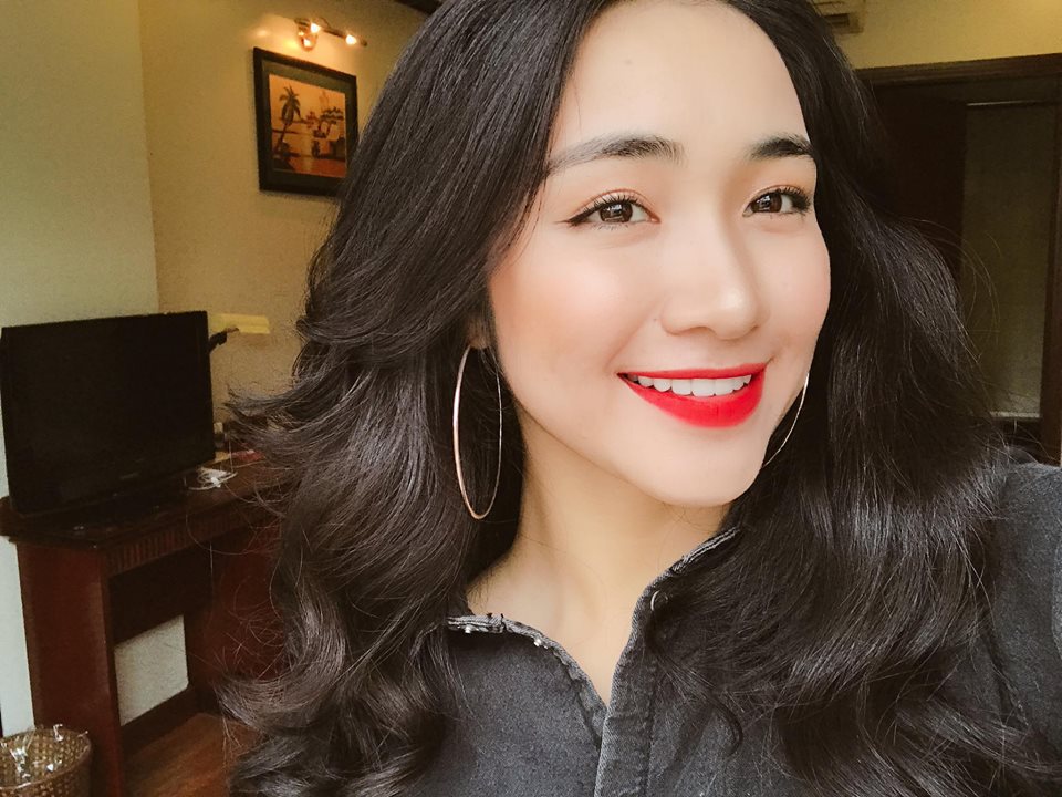 Trong tà áo dài đỏ, màu son đỏ cũng làm nổi bật làn da trắng mịn của cô nàng.