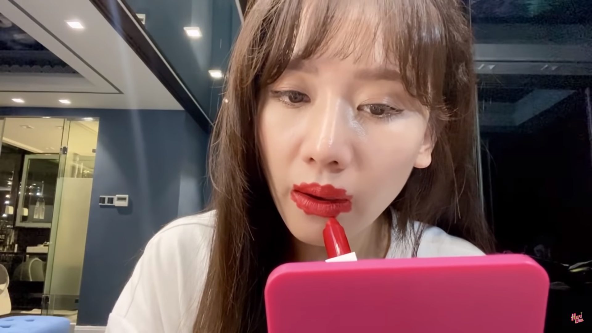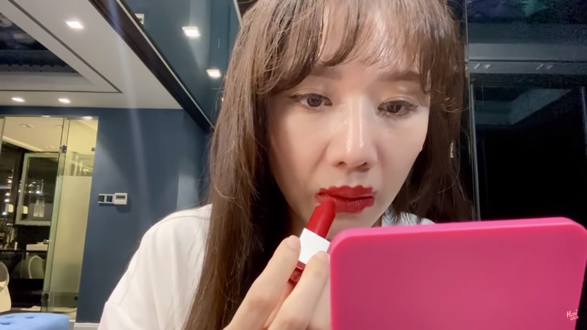 Để thực hiện kiểu make up này, đầu tiên Hari Won vẽ viền môi trước cho dễ tô màu. Sau đó cô tô phần môi trên và môi dưới theo đường viền đã vẽ. Trong suốt quá trình tô phần môi, Hari Won khiến nhiều người bật cười khi liên tục an ủi bản thân là 'ổn ổn'.
