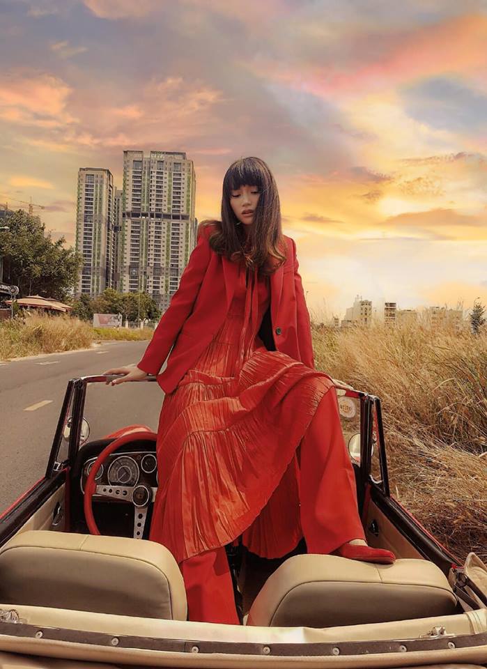 Xuất hiện trong chuỗi quảng bá cho bộ phim “Vu quy đại náo”, nữ hoàng nội y xuất hiện với vẻ đẹp ngọt ngào, sang trọng. Chọn tông makeup cam dịu nhẹ với phần đuôi mắt cùng tông với màu môi, Ngọc Trinh ưu tiên kiểu tóc búi cao, phần mái được đánh xoăn nhẹ.