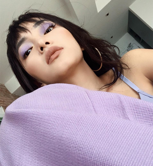 Mắt tím đi cùng quần áo tím, nhưng chi tiết son lì màu nuy mới là điều hay giúp mọi thứ kết nối, không lòe loẹt.