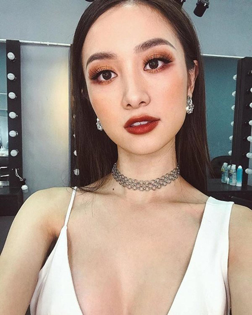 Tuy mắt, môi, má đều đậm nhưng Chi Pu lại lựa chọn những màu liền kề nhau trong bảng thuần sắc, tạo nên hình ảnh một quả hồng hây hây ngọt ngào, chẳng hề kém duyên.