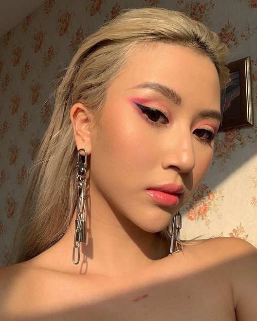 Quỳnh Anh Shyn sử dụng chiêu thức kẻ mắt xếch màu đen dài nhằm dung hòa eyelines mắt màu mè.
