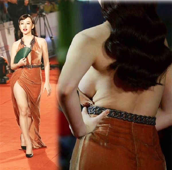 Angela Phương Trinh chẳng những gây bất bình vì mặc váy cắt khoét táo bạo lên thảm đỏ sự kiện trang trọng mà còn mất điểm vì thiết kế phô trương, làm lộ thân hình ”sập xệ”, nhất là vòng 1 trễ nải.