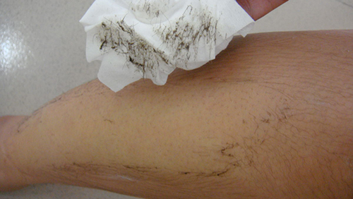 - Dùng bông tẩy trang lau phần da vừa tẩy bạn sẽ thấy những sợi lông rụng đi dễ dàng, và vùng da phần đó trông sáng mịn hơn.