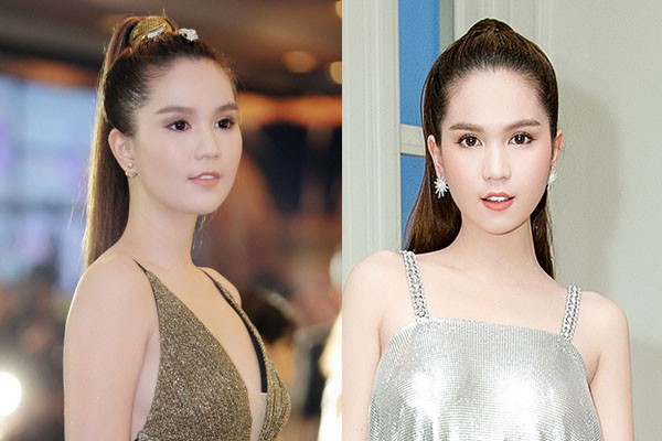 Cách đây không lâu Ngọc Trinh cũng chọn cách trang điểm tương tự với mắt khối nâu nhẹ cũng môi cam đất (ảnh phải) nhưng Ngọc Trinh chọn màu son đậm nên khuôn mặt có điểm nhấn hơn là màu son mờ nhạt như sự kiện vừa qua (ảnh trái).