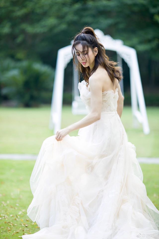 Trong bộ ảnh mặc trang phục cô dâu theo nguyện vọng của mẹ, Lý Nhược Đồng cũng chọn cho mình chiếc váy cưới cúp ngực màu trắng
