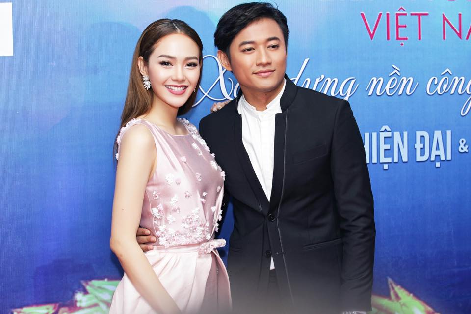 Minh Hằng xinh đẹp rạng rỡ bên cạnh diễn viên Quý Bình. Cô cũng chọn kiểu tóc chải thẳng trẻ trung kết hợp với lối trang điểm tông hồng đất.
