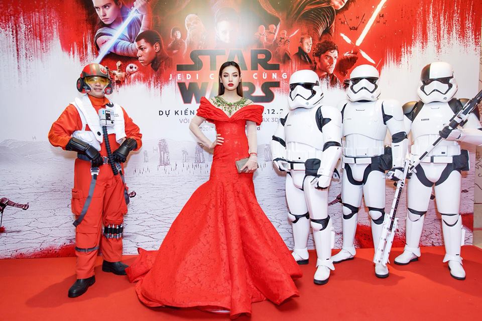 Phương Trinh Jolie đã có màn đầu tư váy vóc rất cầu kì khi dự buổi ra mắt bộ phim Star wars, chỉ có điều, cô lại đầu tư nhầm chỗ. Với sự kiện mang cá tính riêng biệt thế này, Jolie nên chọn một bộ đồ ấn tượng, thay vì một chiếc đầm đuôi cá quét lướt thướt thế kia. Nhìn Phương Trinh đứng chụp ảnh cùng các nhân vật hầm hố đủ hiểu cô đã sai khi lựa đồ.