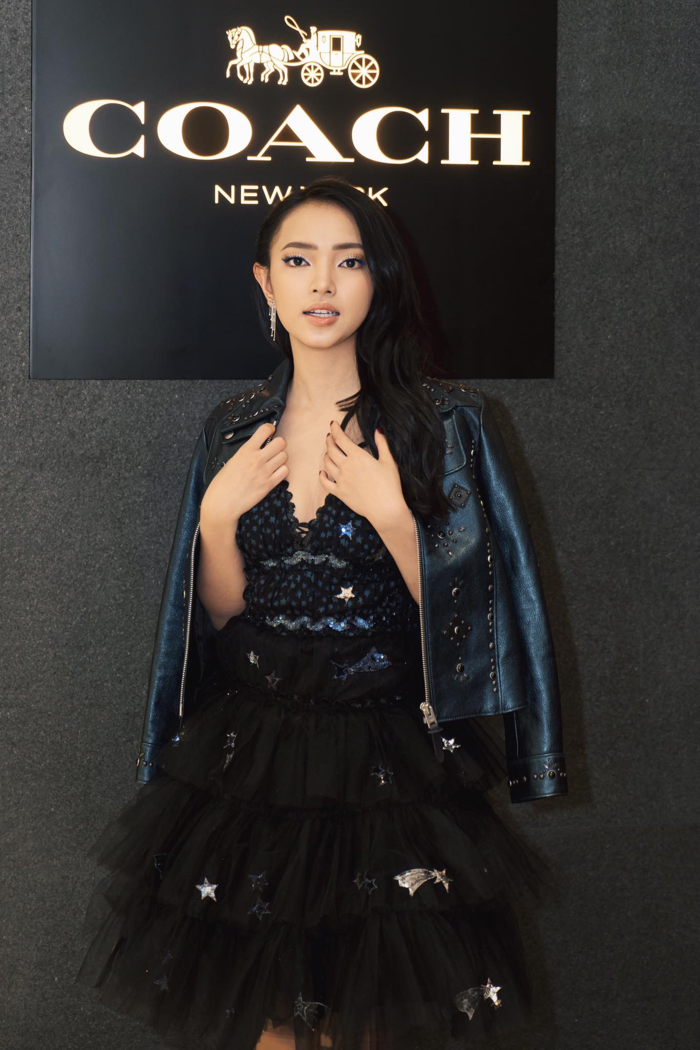 Sau lần ăn mặc thất bại tại sự kiện khai trương Zara, Châu Bùi rút kinh nghiệm sâu sắc và có màn trở lại ấn tượng trong buổi khai trương cửa hàng đầu tiên của Coach. Cô nàng chọn tone màu mắt xanh kết hợp với mái tóc đen cá tính.
