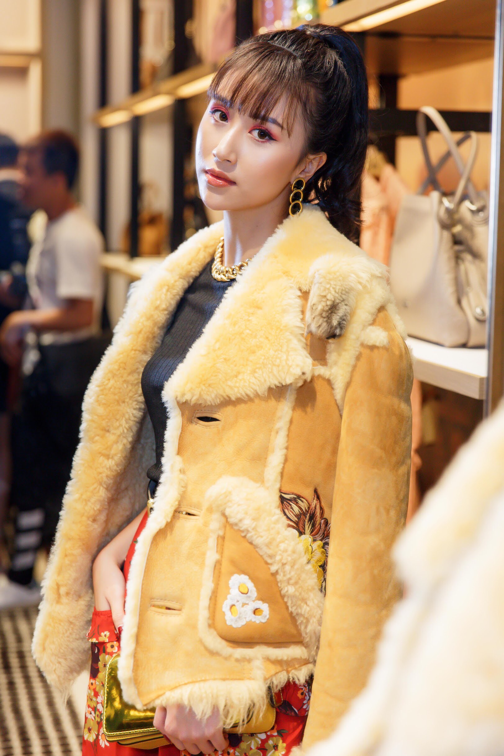 Không chỉ chịu chơi diện áo khoác lông, Quỳnh Anh Shyn còn gây ấn tượng bởi đôi mắt màu đỏ ấn tượng. Chọn tone son trầm hơn, Quỳnh Anh Shyn thực sự xinh đẹp và rất sành điệu.
