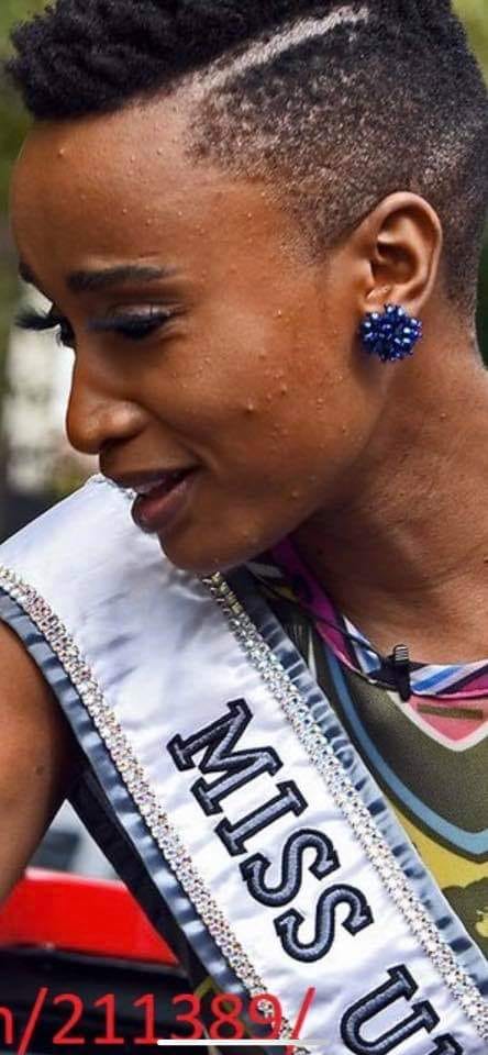 Mặc dù đã có lớp make up nhưng cũng không che nỗi những khuyết điểm trên gương mặt Zozibini Tunzi.