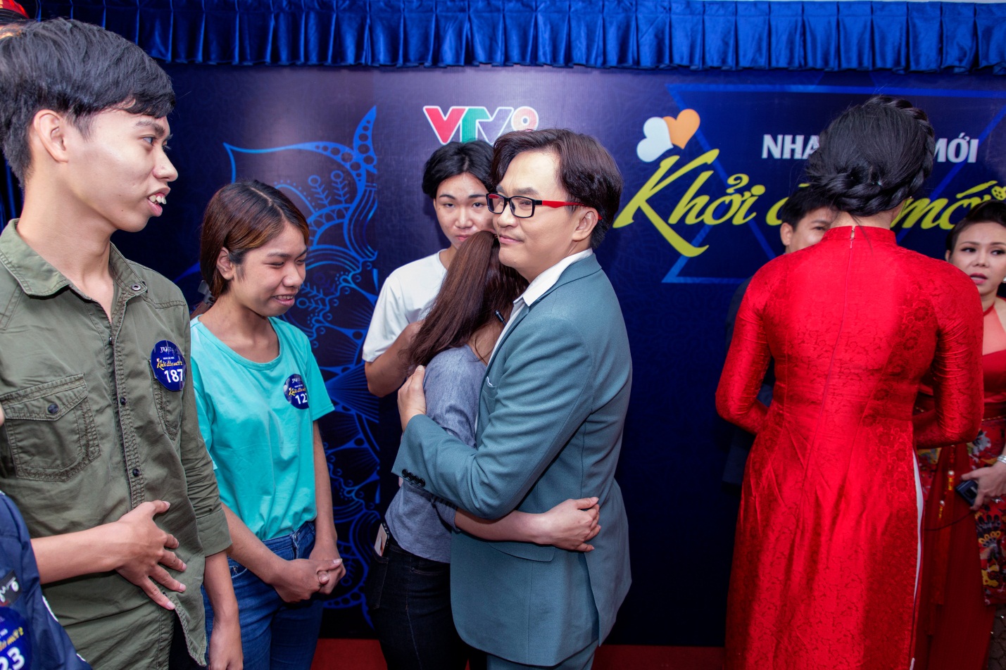 Đại Nghĩa gây thiện cảm với nhiều bạn trẻ, anh đến động viên từng người, ôm chầm lấy họ. Nam MC còn chụp ảnh, ký tặng các thí sinh.