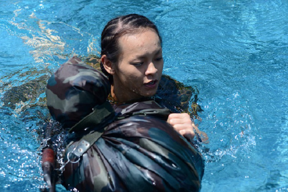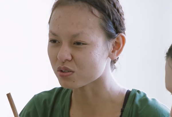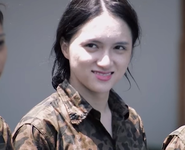 Khả Ngân lộ rõ nếp nhăn cánh mũi và hai bên khỏe miệng khi để mặt mộc ghi hình show thực tế về cuộc sống quân ngũ.